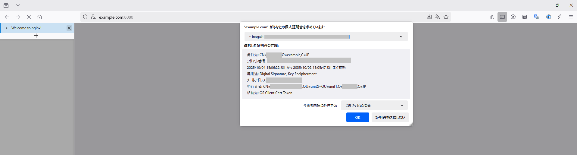 クライアント証明書を求められる。インポートしたクライアント証明書を選択することでアクセスできる。
